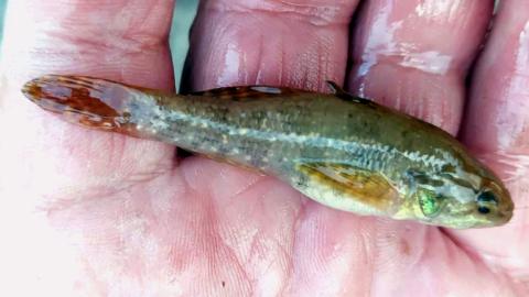 A képen látható hal teste zömök, szája nagy, két különálló hátúszóval és lekerekített farokúszóval rendelkezik, hasúszói kicsik, a képen alig látszanak és a mellúszó alatt helyezkednek el. Alapszíne barnászöld, melyet nagyobb foltok és pettyek díszítenek. Mindezek alapján a hal egy Távol-Keletről, az Amur folyó vízgyűjtőjéből származó inváziós amurgéb (Percottus glenii).